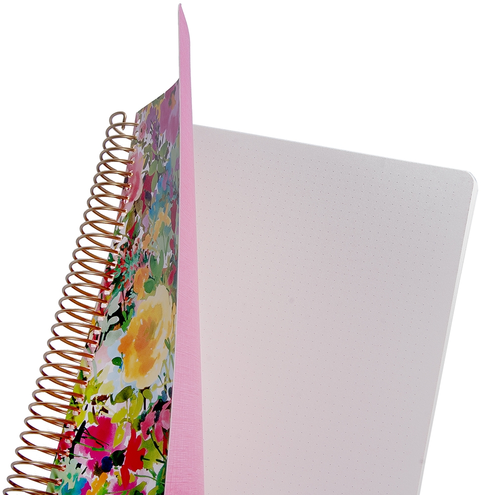 Dit Notitieboek spiraal Floral is niet alleen vrolijk door de vrolijke bloemenprint, maar ook praktisch door de goudkleurige brede spiraal waardoor de pagina’s eenvoudig zijn om te slaan. Met de 240 dotted pagina’s kun je er veel dromen, ideeën, to-do’s, plannen en strategieën in kwijt. De binnenkant van de kaft heeft een vrolijke bloemenprint.