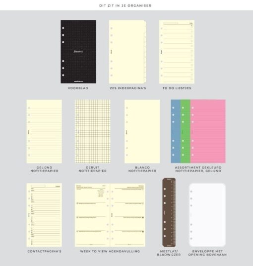 - Geleverd met 2025 agenda (1 week 2 blz), tabbladen, liniaal, lijntjes en ruitjes papier en to-do papier.