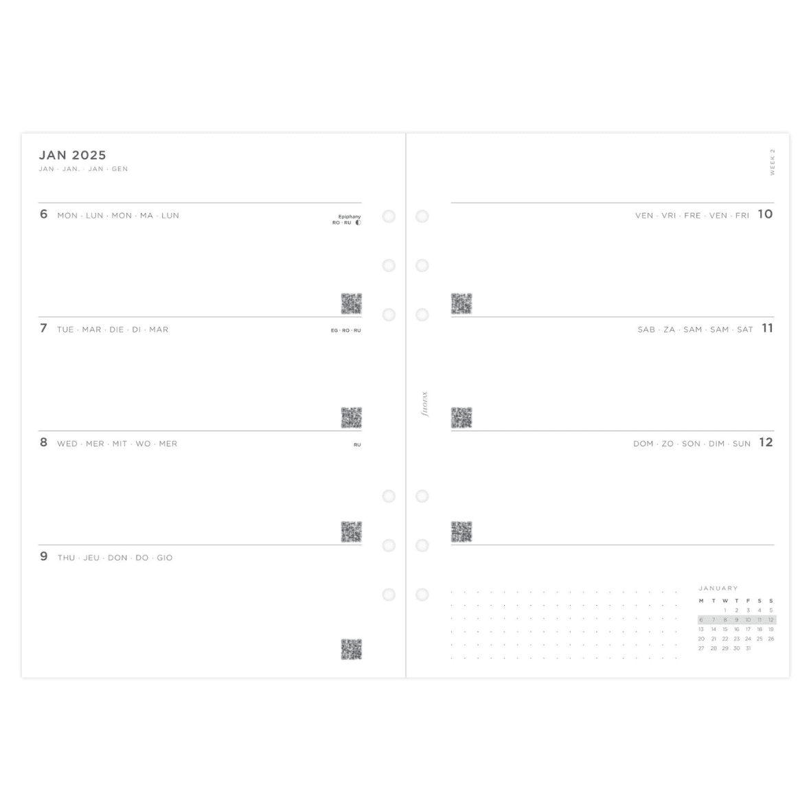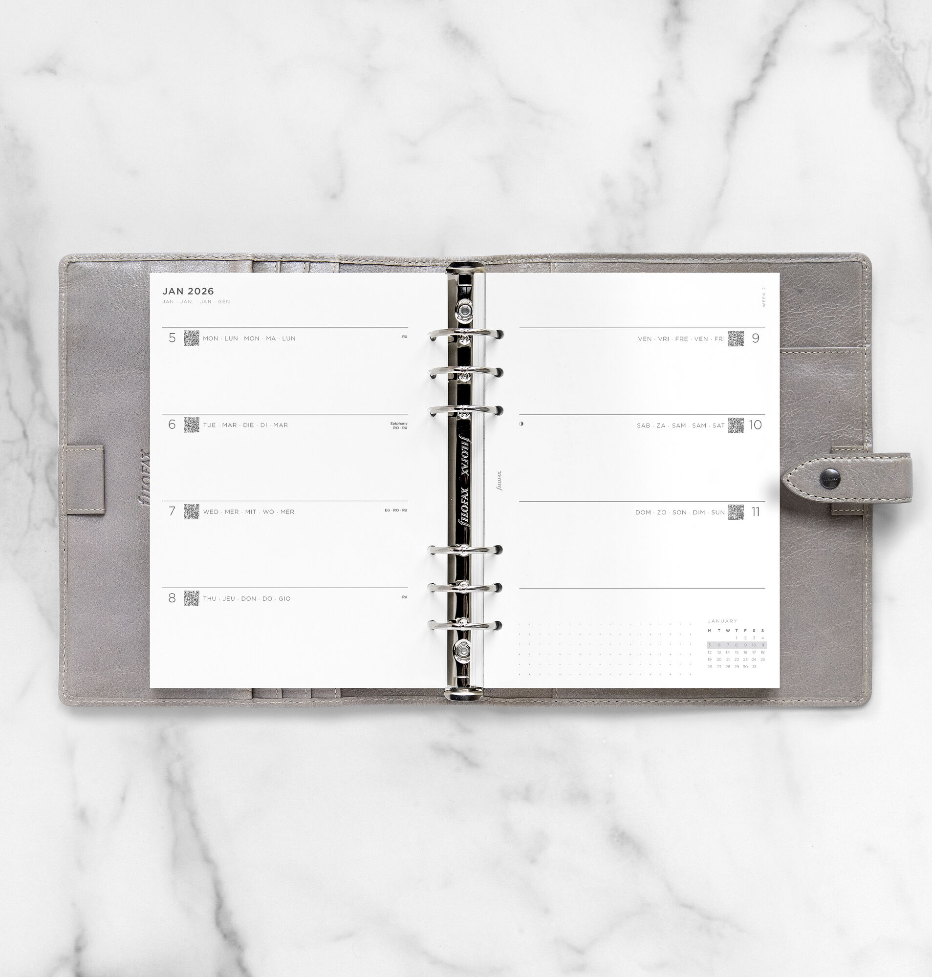 Heb je al een Filofax organizer die je wilt hergebruiken? Dan kan de losse inhoud een goede (en voordeliger) keus zijn. Speciaal voor de Filofax organizers hebben we nu ook de Filofax navulling organizer A5 / 2026 – 7 dagen 2 pagina’s (Minimal). Geef jouw plannen een persoonlijk tintje met deze Minimal navulling.