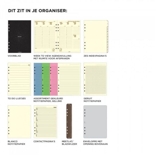 De Filofax organizer kun je dus aanvullen of hervullen met de navullingen die jij wilt. Je kunt de Filofax met het drukknoopje sluiten en er zit ook een liniaal in om als boekenlegger te gebruiken. Je ontvangt deze organizer met 2025 agenda invulling, een liniaal/boekenlegger, to-do papier, blanco en gekleurd notitie papier, tabbladen en ruimte voor adressen. Voor en achterin de planner zitten vakjes waar je stickers en papiertjes kunt bewaren. Een planner waar je heel veel plezier van gaat hebben voor een langere periode omdat je deze gewoon steeds kunt aanvullen met nieuw papier of een nieuwe agenda vulling (met of zonder datum).