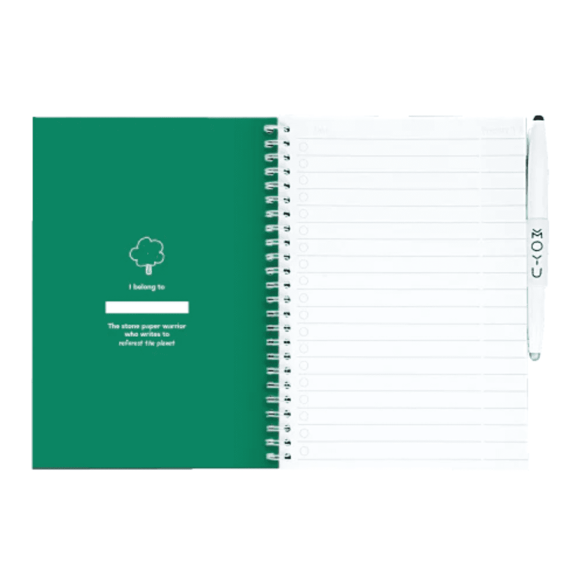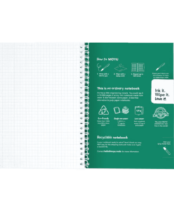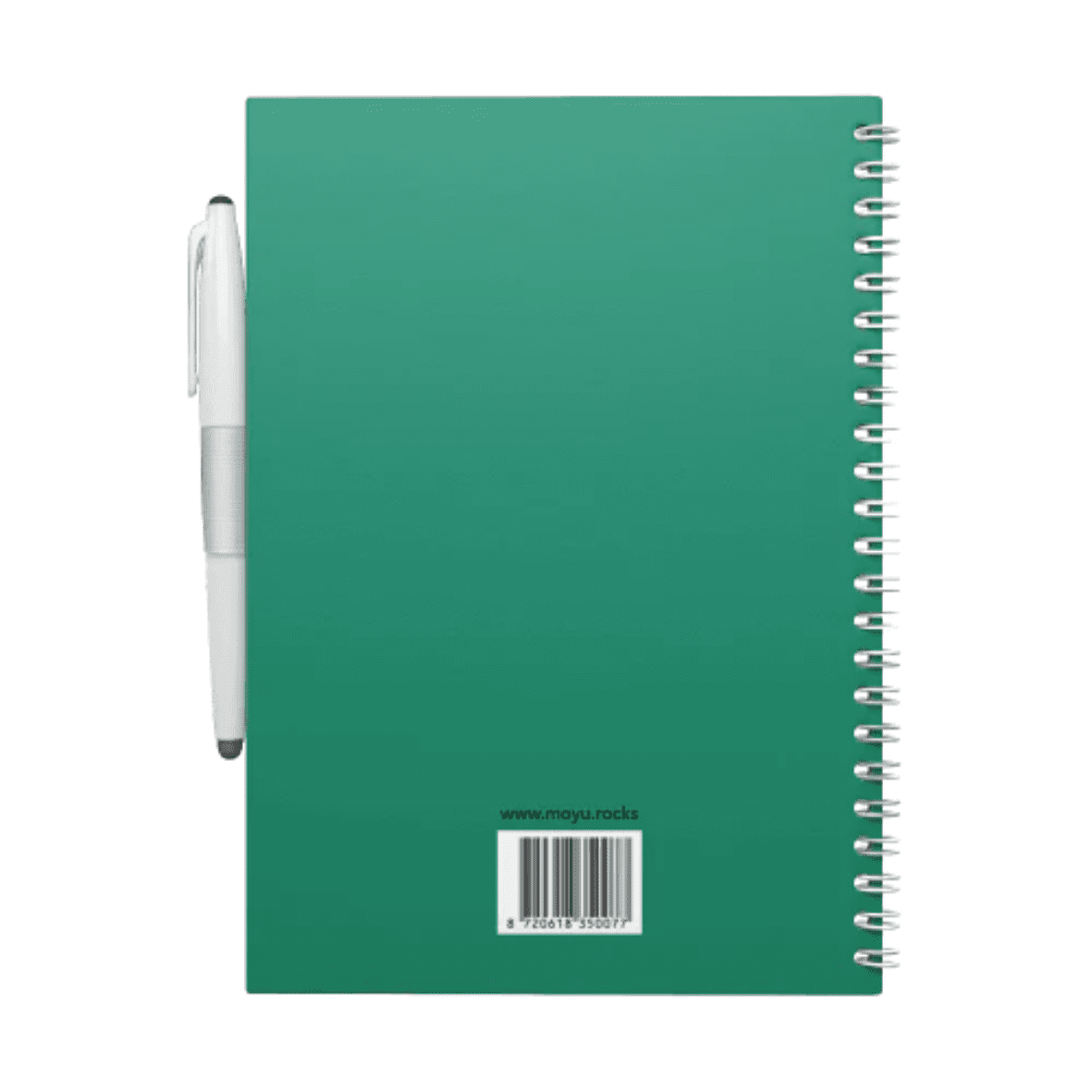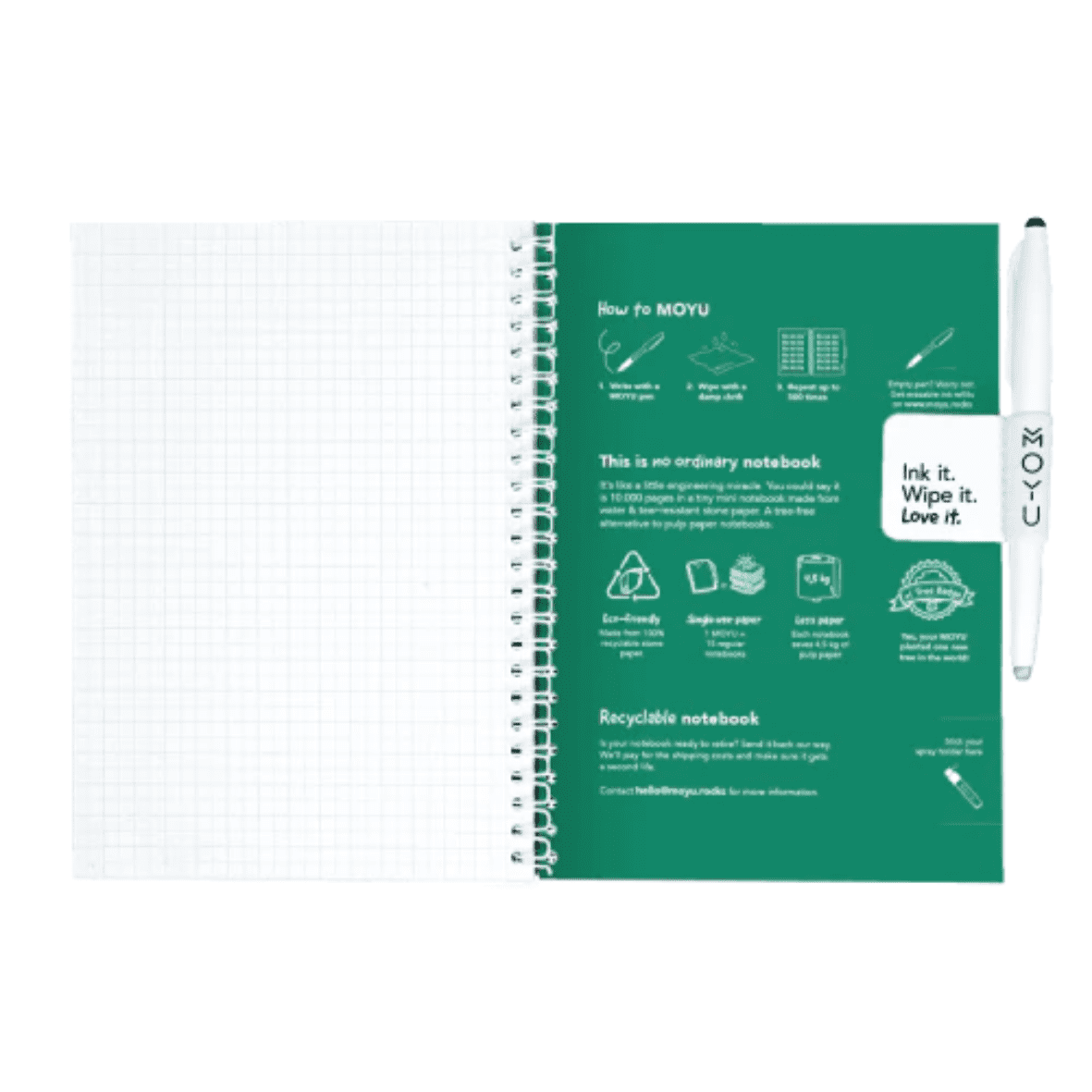 Een MOYU notitieboek is gemaakt van steenpapier. Maar dit steenpapier is nog specialer dan je misschien al eens eerder gezien of geprobeerd hebt. Dit steenpapier is namelijk heel stevig. Bij het notitieboek zit een Pilot Frixon pen en een doekje geleverd. Je schrijft in het notitieboek met deze pen. En met een vochtig doekje veeg je in 1x de tekst weg die je hebt opgeschreven. Het eraf vegen gaat niet zomaar als je er met je hand overheen gaat, dus de tekst blijft goed zitten. Maar zodra je er overheen gaat met een nat doekje is jouw pagina weer helemaal leeg. En vandaar het stevige papier. Hierdoor kan je een bladzijde tot wel 500x gebruiken en schoonmaken!