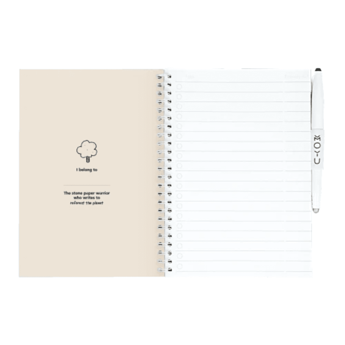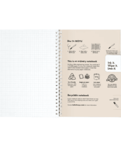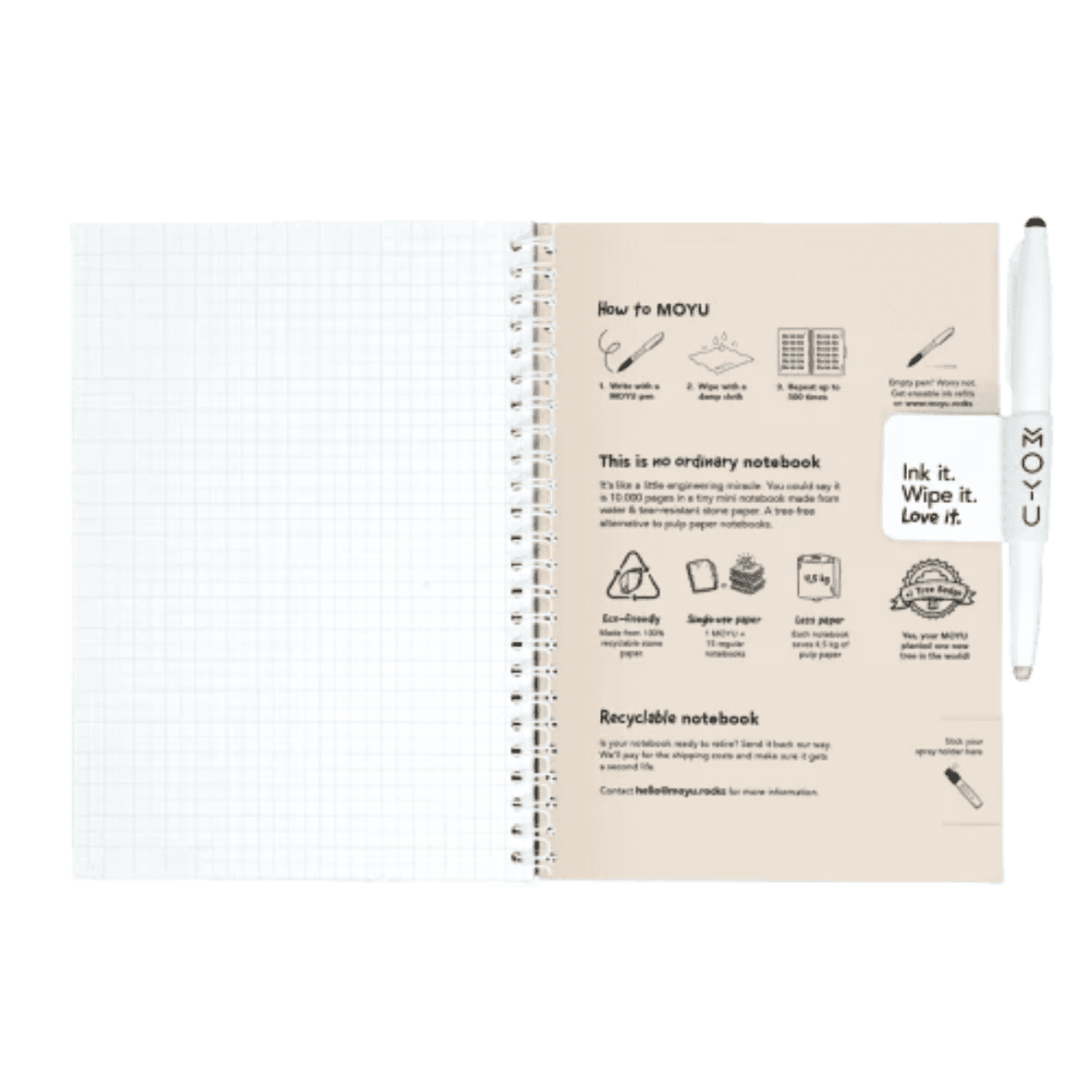 Een MOYU notitieboek is gemaakt van steenpapier. Maar dit steenpapier is nog specialer dan je misschien al eens eerder gezien of geprobeerd hebt. Dit steenpapier is namelijk heel stevig. Bij het notitieboek zit een Pilot Frixon pen en een doekje geleverd. Je schrijft in het notitieboek met deze pen. En met een vochtig doekje veeg je in 1x de tekst weg die je hebt opgeschreven. Het eraf vegen gaat niet zomaar als je er met je hand overheen gaat, dus de tekst blijft goed zitten. Maar zodra je er overheen gaat met een nat doekje is jouw pagina weer helemaal leeg. En vandaar het stevige papier. Hierdoor kan je een bladzijde tot wel 500x gebruiken en schoonmaken!