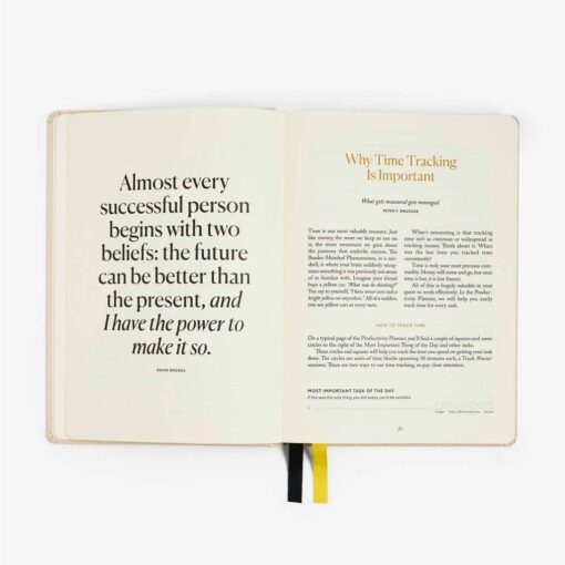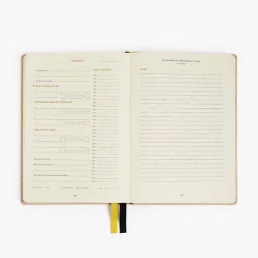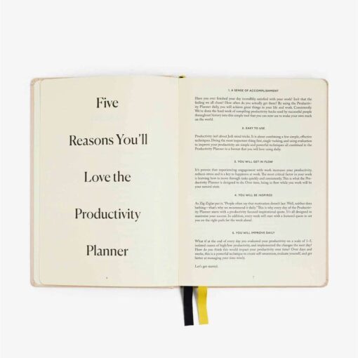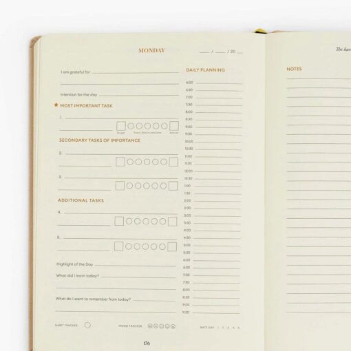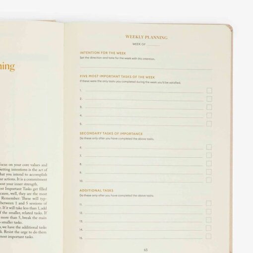 - Wekelijkse planning + reflectie: aan het begin van elke week helpt de productiviteitsplanner je je week te plannen voor succes. Aan het einde van elke dag en elke week zul je nadenken over hoe effectief je was, je helpen om je patronen te leren en te verbeteren voor morgen.