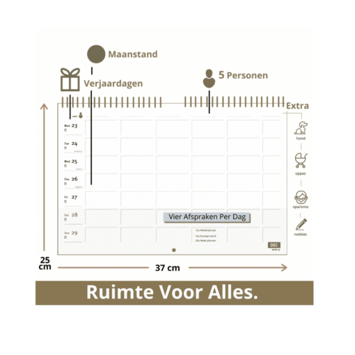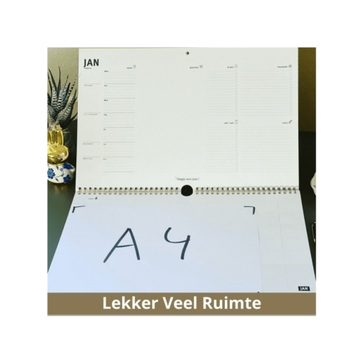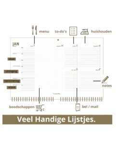 De family planner is geschikt voor 5 personen. Handig, want juist door agenda’s te combineren krijg je gericht tijd voor elkaar. Het halve vakje dat over blijft, is ideaal voor terugkerende taken zoals het vuil buiten zetten of schrijf er algemene notities in als vakantie of geef het vrije vakje aan oma, opa, de oppas of de hond.