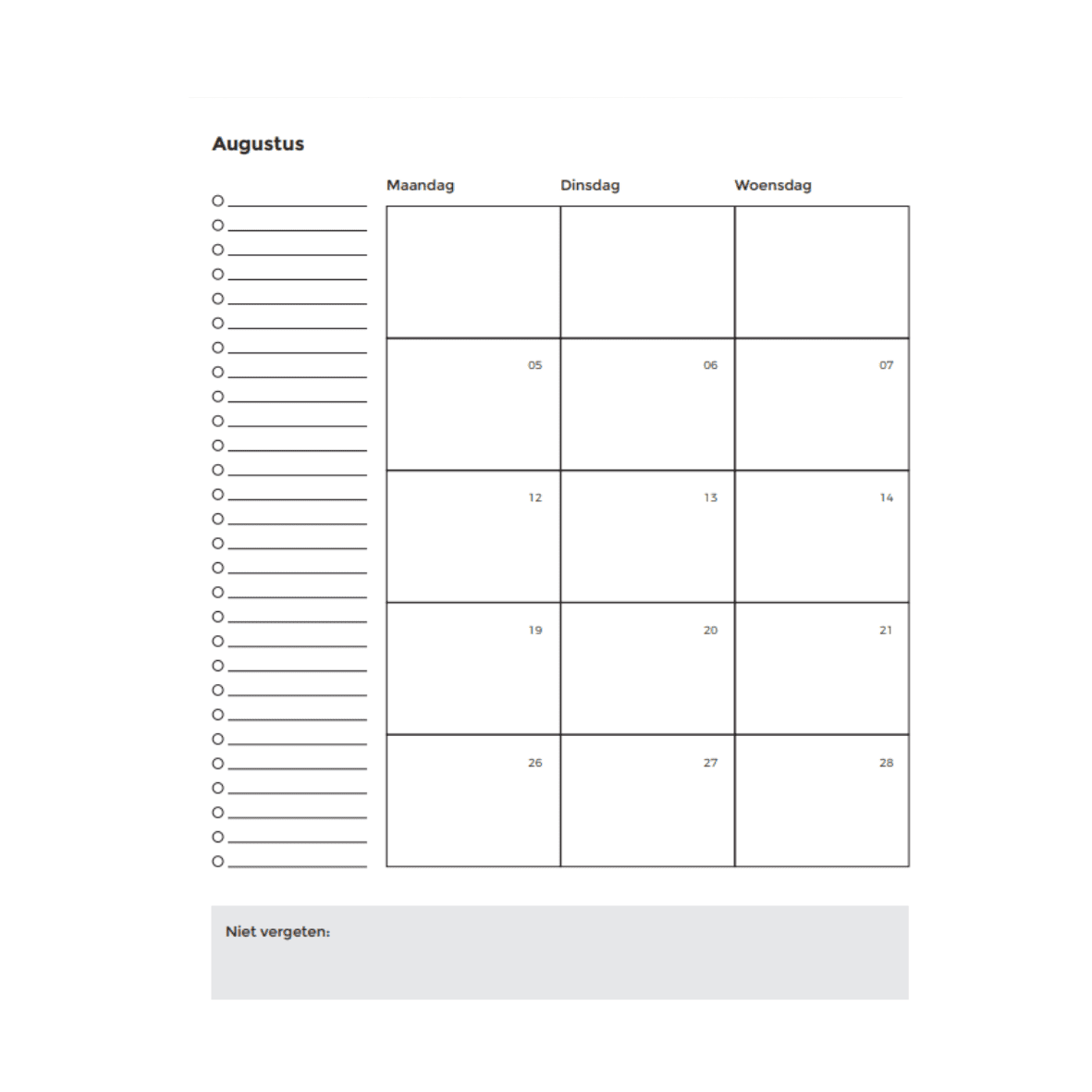 Wegens succes terug in de Structuurjunkie-lijn van Cynthia Schultz: een planner mét datum! De Structuurjunkie Planner 2025/2026 is een prachtig uitgevoerde planner. Je vindt in de planner jaaroverzichten, maandoverzichten én weekoverzichten, alsook lijntjespagina’s achterin. De Structuurjunkie-planner 2025/2026 loopt van augustus 2025 t/m begin september 2026! Op elke pagina is voldoende ruimte aanwezig om bijkomende taken te noteren.